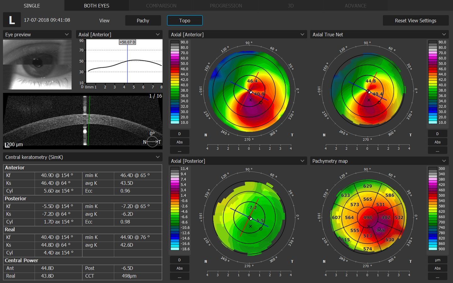 - Precise Astigmatism Display Option (SimK: Anterior, Posterior, Real, Meridian and Emi-Meridian ø 3, 5, 7 mm zones)