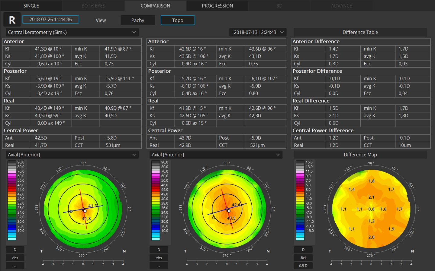 The follow-up feature in the T-OCT™ module gives the possibility to fully compare the changes in the corneal topography over time for: